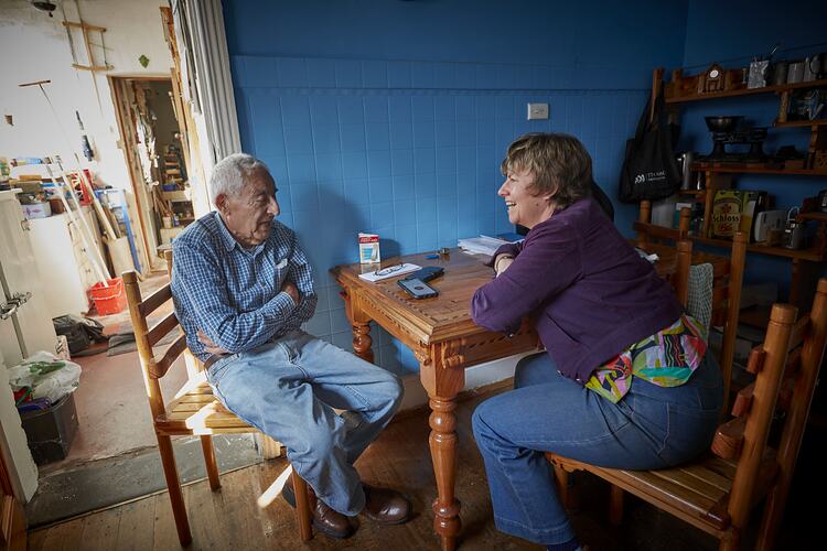 Digital photograph taken at Joseph Scerri's home in Brunswick of Joseph being interviewd by Dr Moya McFadzean, Senior Curator Migration & Cultural Diversity, Museums Victoria. The photograph was taken in his kitchen on 20 March 2023 by Museums Victoria photographer Jon Augier to document Joseph's workspace, including tools, materials and moulds, in which Joseph created the guitar and mandolin acquired for the Museum's collection.
