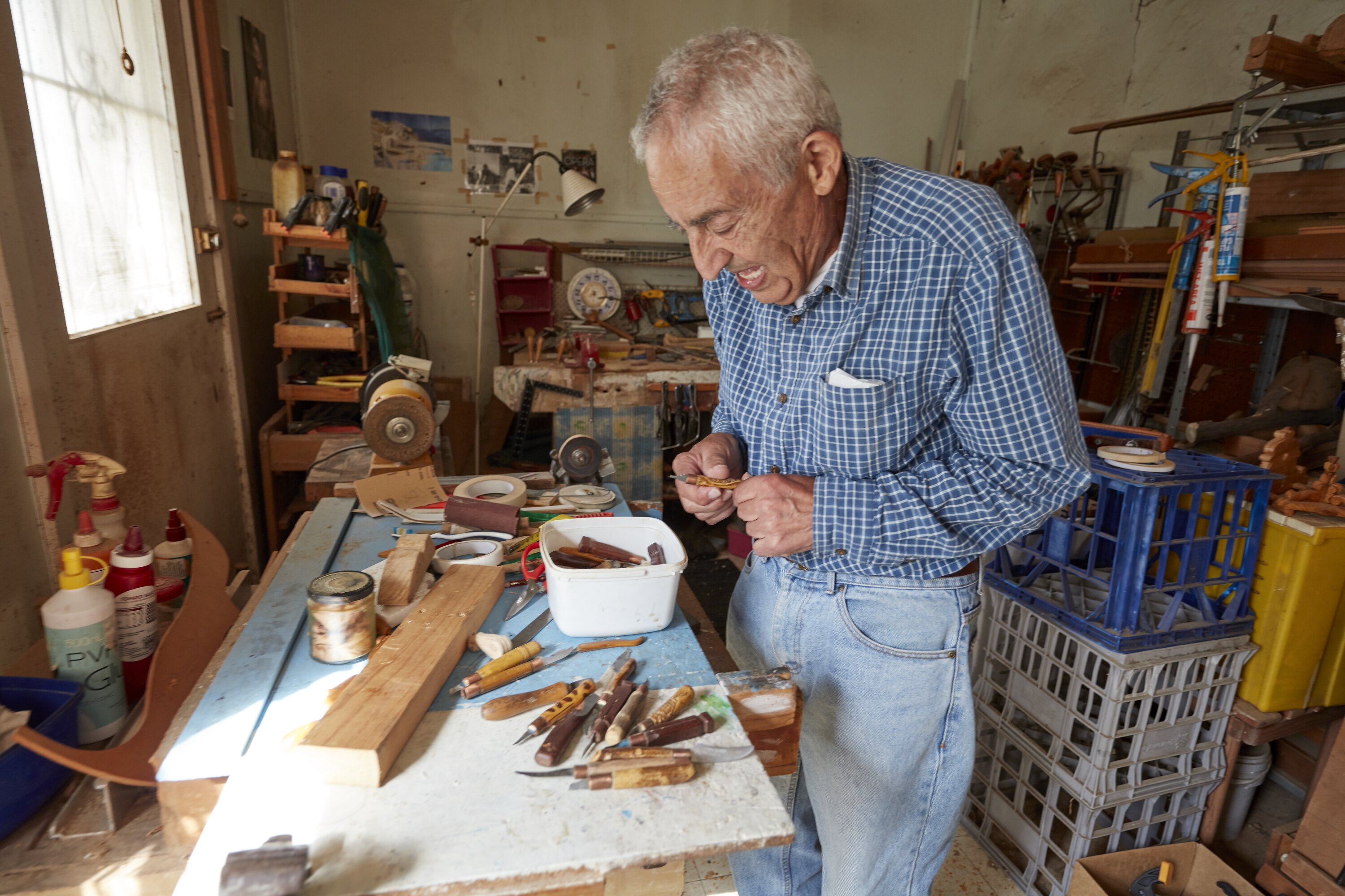 Digital photograph taken in Joseph Scerri's home woodworking workshop in Brunswick, of Joseph looking at his hand-made carving knives he subsequently donated to the Museum (HT 58384 - HT 58392 and HT 58396). The photograph was taken on 20 March 2023 by Museums Victoria photographer Jon Augier to document the workspace, including tools, materials and moulds, in which Joseph created the guitar and mandolin acquired for the Museum's collection.