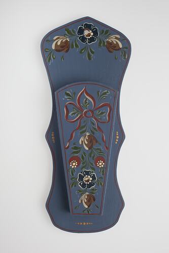 Ornately painted wooden scissor holder constructed from craft wood to hang on the wall like a plaque. Two adhesive patches are fixed to the back. The holder is painted blue with red edging and a floral motif in the Hindeloopen style. The item has been signed by the maker.