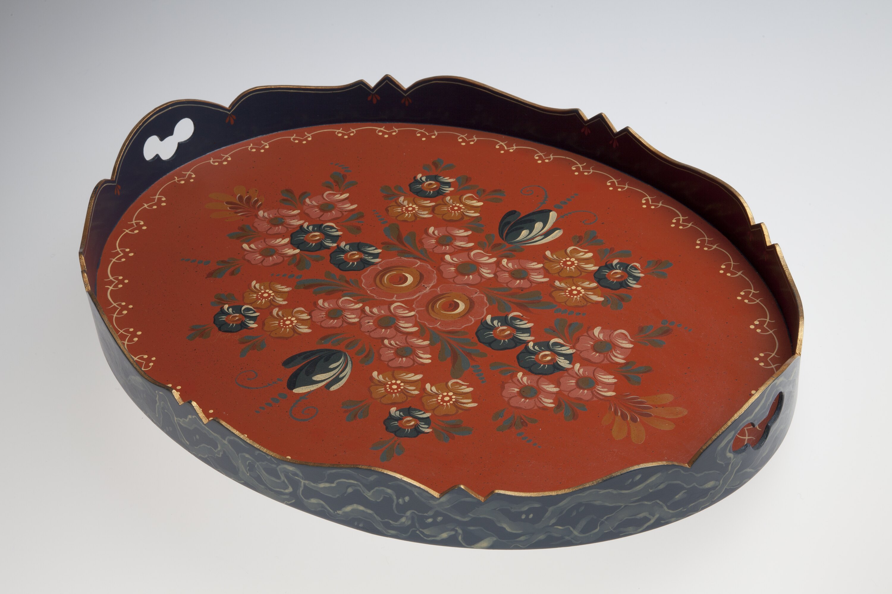 Large oval wooden tray constructed from craft wood with high decoratively cut edges. Sides are painted blue with gold edges and painted scroll details. The base of the tray is terracotta with floral motifs in the Hindeloopen style. The underside has been signed by the maker.