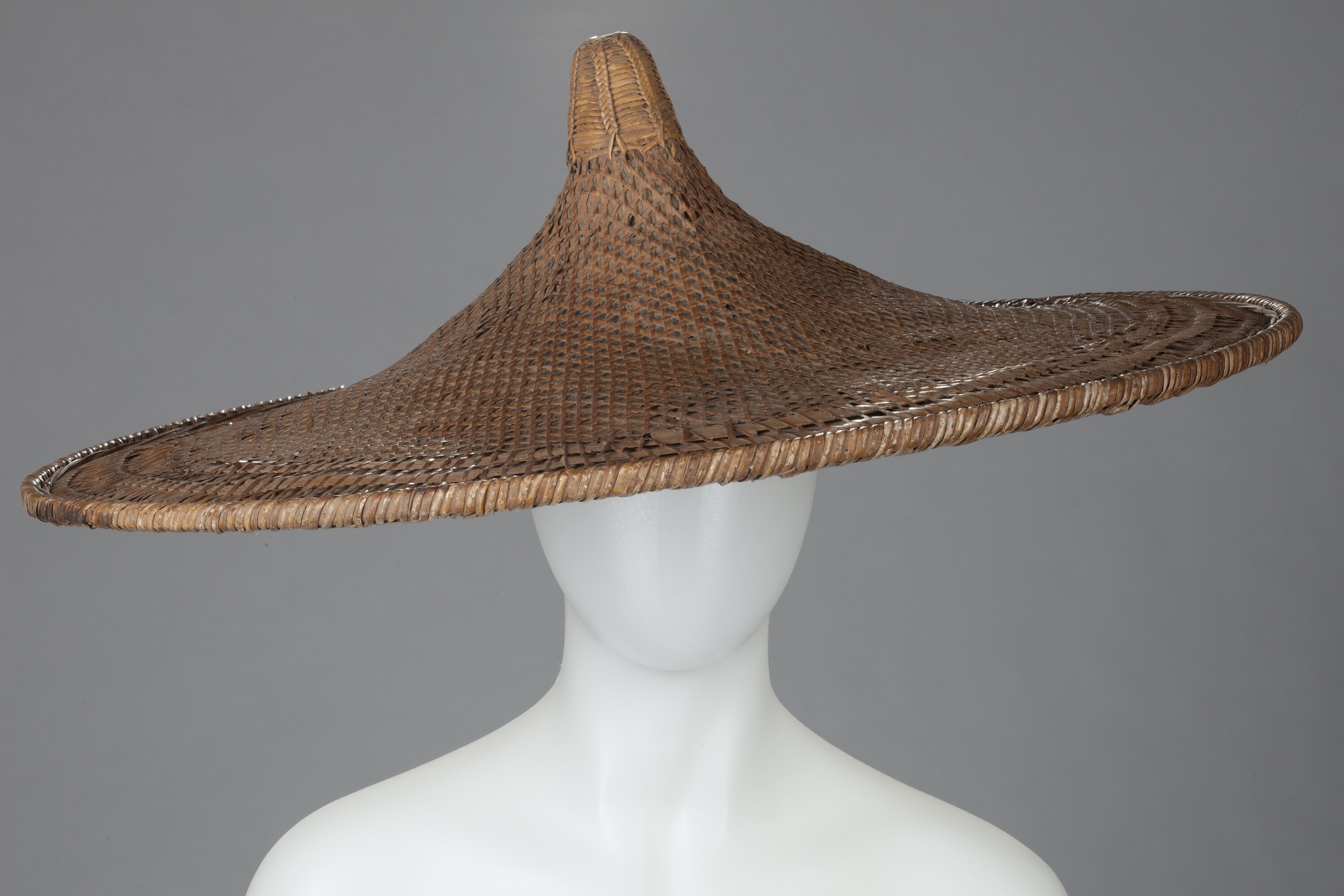 Wide brimmed conical-shaped hat, made from cane and other vegetable matter. This hat, together with the related basket (SH 90.659) and Chinese field cape (SH 90.661), had been in possession of a family who occupied the same property for four generations at Smeaton, Victoria. This style of hat has been commonly worn in many countries across Asia for centuries and is used primarily as protection from the sun and rain. When made of straw or matting, it can be dipped in water and worn as an impromptu evaporative-cooling device.