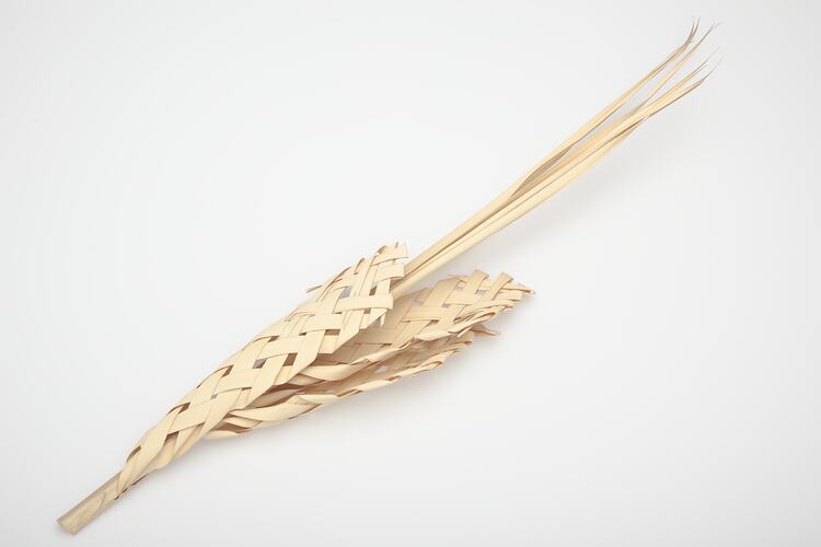Part of the central rib of the leaf of a palm tree forms the base upon which the fronds have been plaited into three pointed panels. Seven fronds have not been woven and are left free at the top.