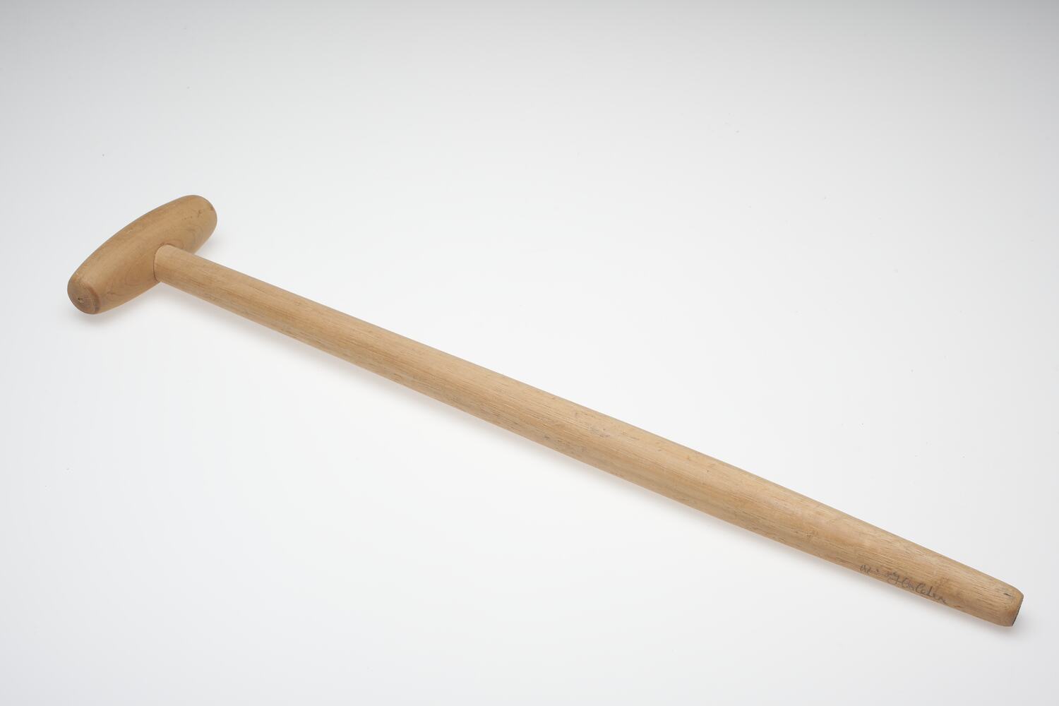 Handle similar to those which fit onto spades and shovels consisting of a wooden, cylindrical stem which is narrower at the top and bottom than in the middle. Across the top there is a short cylindrical piece which forms the top of this T-shaped handle. Like the stem, it is narrower at the ends than in the middle.
