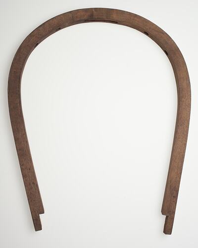Horseshoe-shaped chair back. At top part, the uppermost curve, there are four drilled holes, two pair either side of a rectangular gouge. This is, perhaps, where the uprights of the back were attached. At the two ends there is a cut on the inside 3cm from the bottom, forming a wedge. One nail protrudes from one side.