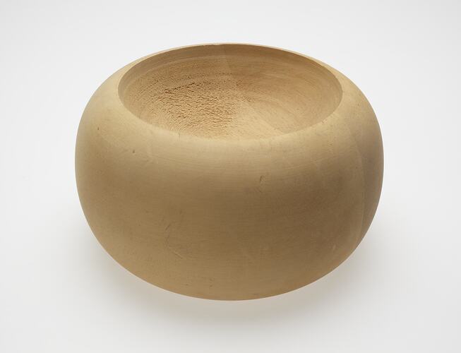 Unfinished wooden bowl made from pale gold-coloured wood. Bowl is shaped like a round sided disc which has a shallow concave basin in the top and very smooth finished outer sides. Object seems to be made from two pieces of wood.
