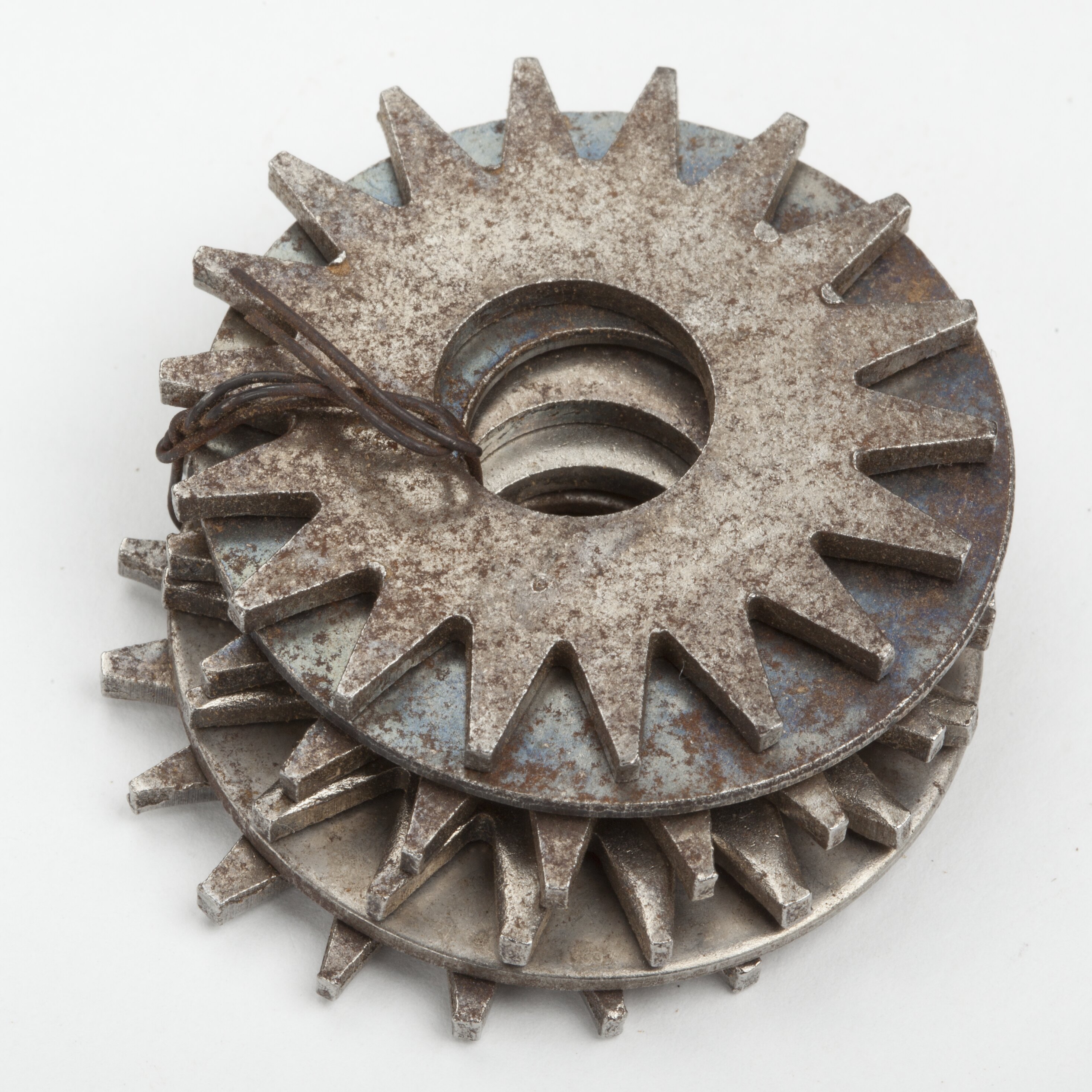 Six circular flat discs bound together with a piece of wire. Four of the discs have a zig-zag tooth pattern around exterior of disc. Two of the discs are round.