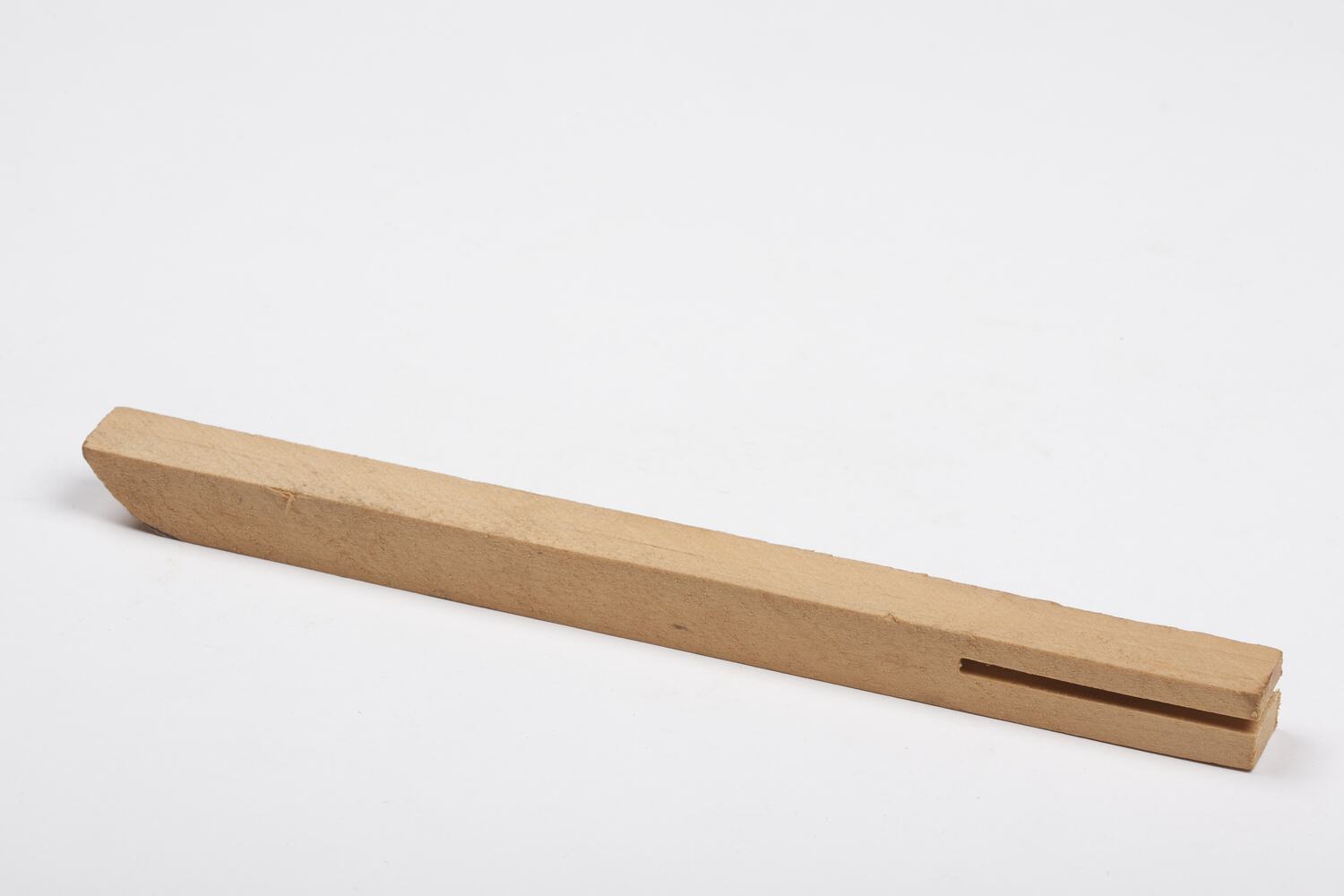 Light brown rectangular length, with one semi-curved end, and full depth narrow slit in middle for one-third length.