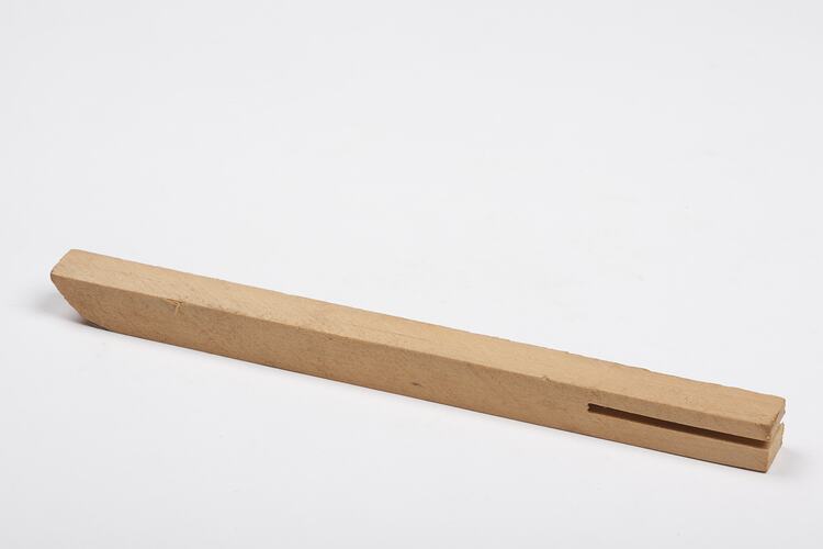 Wooden sharpening accessory made by Adolph Bruhn & Son, circa 1980s. It was found in Area D4 at Adolph Bruhn & Son's Wood Turners Shop, 283 Coventry Street, South Melbourne. It was presumably used as a sharpening implement/aid in conjunction with a Grinder. The business was established by Adolph Bruhn circa 1893 in Little Collins Street, Melbourne. Upon his death in 1919 it was then operated by Adolph's son Sophus Christopher Bruhn. Upon Sophus's death in 1959 his son Sophus Walter Bruhn took over the business. In 1970 Sophus reduced the scale of the business and relocated to South Melbourne. The business closed upon Sophus's death in January 1990.