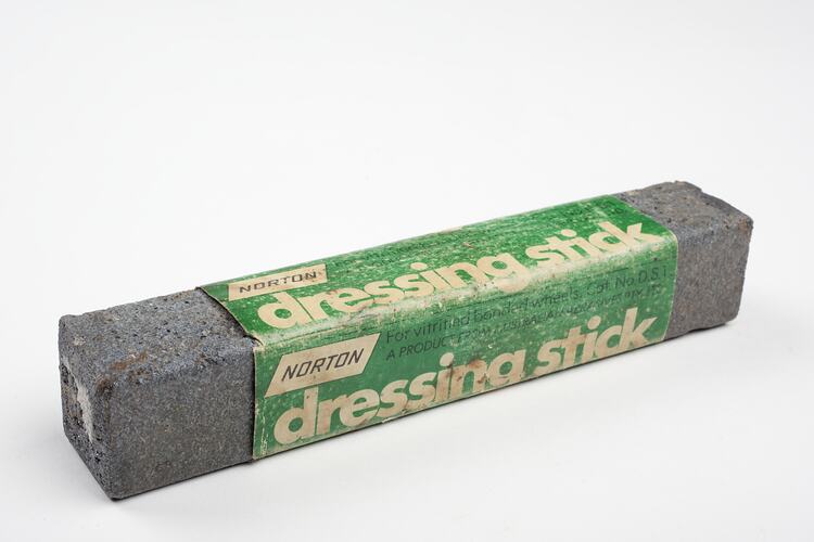Dressing stick made by Norton, circa 1985 - 1989. It would have been used with a grinding wheel, it was found in Area D4 at Adolph Bruhn & Son's Wood Turners Shop, 283 Coventry Street, South Melbourne. The business was established by Adolph Bruhn circa 1893 in Little Collins Street, Melbourne. Upon his death in 1919 it was then operated by Adolph's son Sophus Christopher Bruhn. Upon Sophus's death in 1959 his son Sophus Walter Bruhn took over the business. In 1970 Sophus reduced the scale of the business and relocated to South Melbourne. The business closed upon Sophus's death in January 1990.