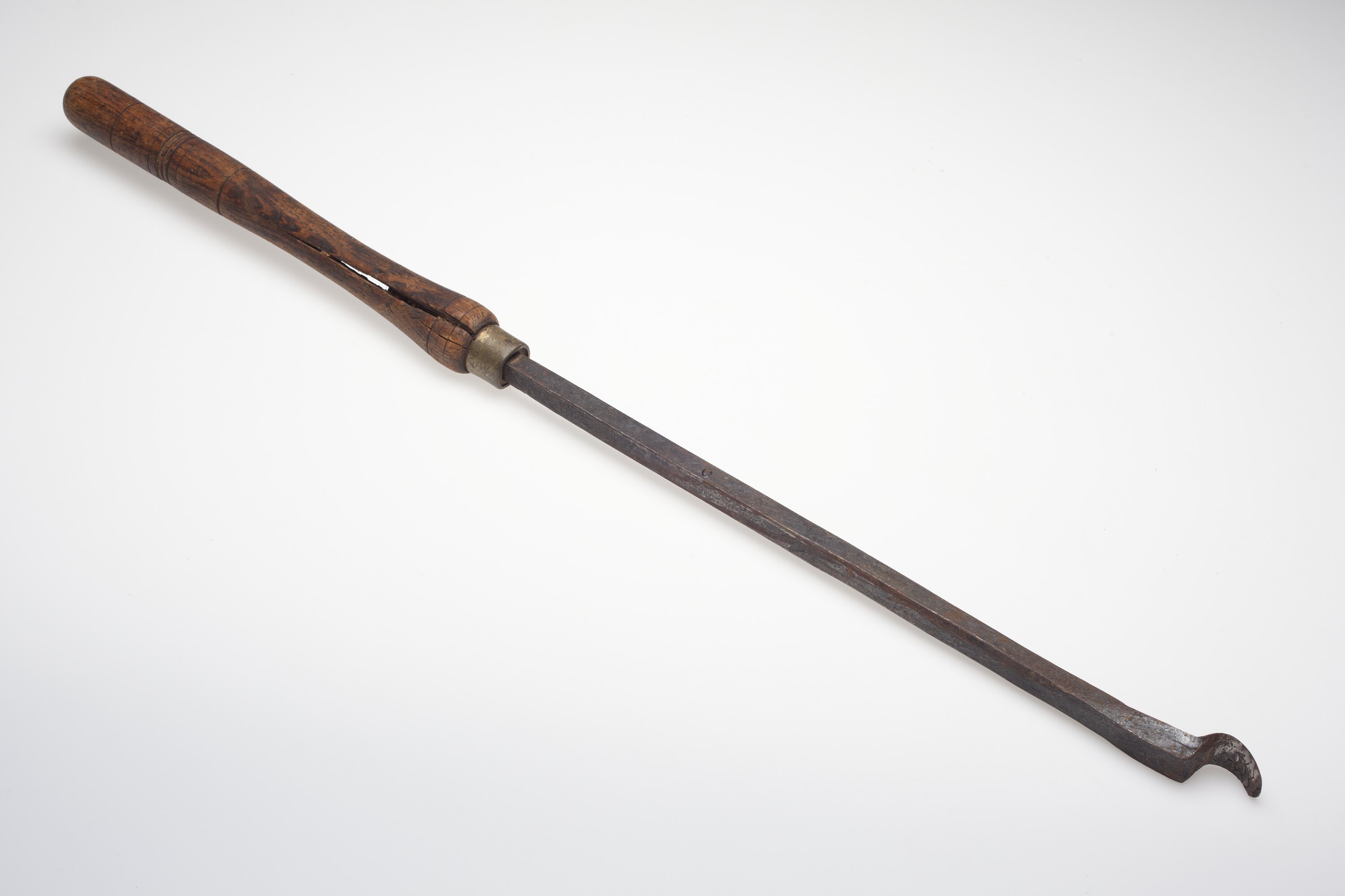 Blackened steel spoon bit turning chisel. The brass hoop at the base of the chisel's polished wooden handle has not prevented the handle splitting.