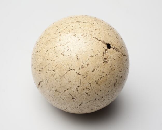 Ivory Billiard Ball made by Adolph Bruhn & Son, circa 1900-1975. It was found in Area C at Adolph Bruhn & Son's Wood Turners Shop, 283 Coventry Street, South Melbourne. The business was established by Adolph Bruhn circa 1893 in Little Collins Street, Melbourne. Upon his death in 1919 it was then operated by Adolph's son Sophus Christopher Bruhn. Upon Sophus's death in 1959 his son Sophus Walter Bruhn took over the business. In 1970 Sophus reduced the scale of the business and relocated to South Melbourne. The business closed upon Sophus's death in January 1990.