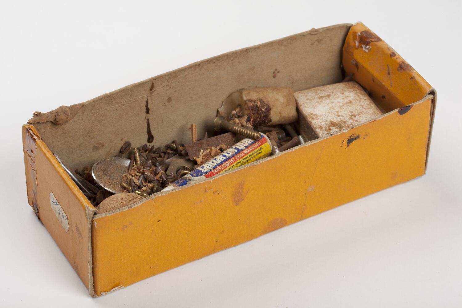 Rectangular cardboard box without lid, containing: Box of matches, Plastic container of cough lollies, Pair of tweezers, Spoon, Razor blade (rusted), Candle, Decorative turned wooden item, Three brass nuts, Two cylinders of dark resin, Nine brass hooks, One brass hinge, Approximately 30 countersunk screws, Approximately 80 nails of various lengths and widths.