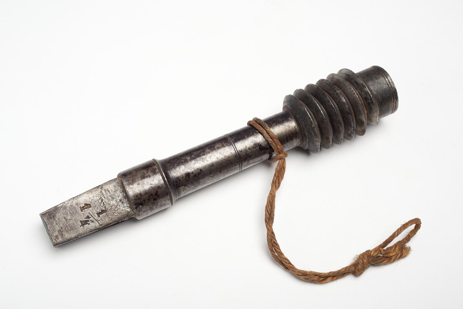 Tool has elongated square base, then a wider band which tapers into a cylinder to form the body. The head is a continuous hollow spiral and just below the tip are two holes opposite one another. There is a piece of string tied around the body.