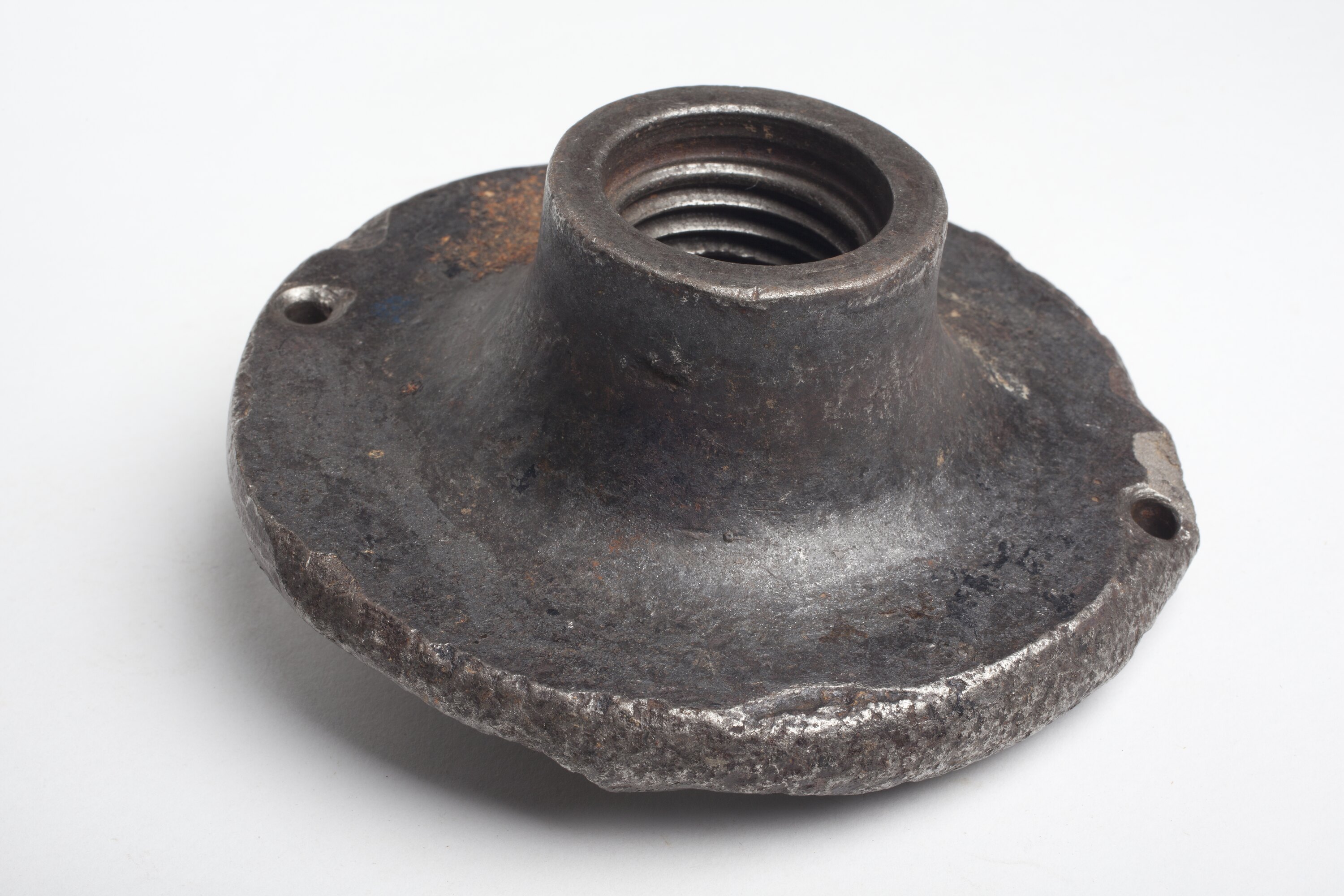 Circular piece of metal with flat sides with small protruding metal thread in centre of one side, and tapering into round screw hole on other. Two holes are in the edge of the disc on opposite edges.