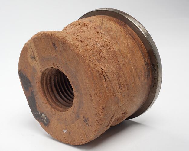 Round metal disc with screw protruding to one side, and with round wooden block attached to the other side, with screw hole in middle.