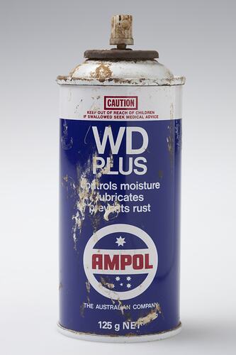 Inscribed: CAUTION/KEEP OUT OF REACH OF CHILDREN/IF SWALLOWED SEEK MEDICAL ADVICE/ WD/PLUS/CONTROLS MOISTURE/LUBRICATES/PREVENTS RUST/AMPOL/THE AUSTRALIAN COMPANY/125 G. NET.