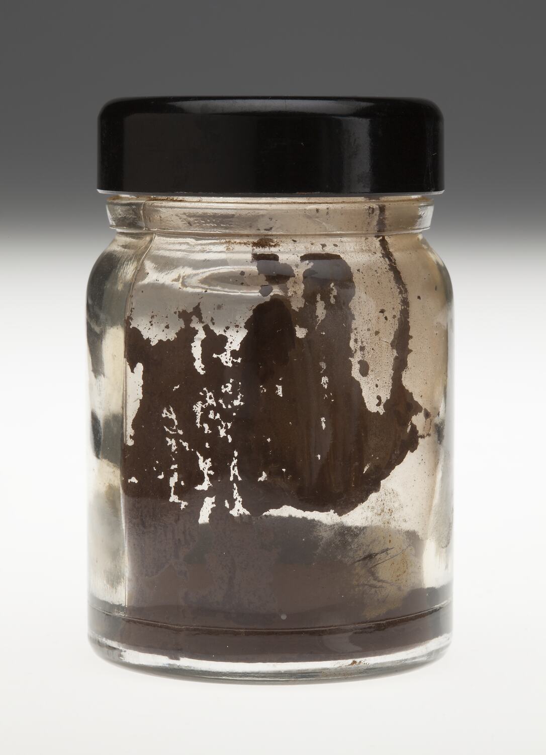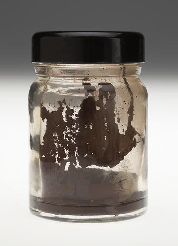 Glass jar containing burnt umber pigment used by Adolph Bruhn & Son, circa 1970-1990. It was found on a shelf of the carpenter's bench in Area E3 at Adolph Bruhn & Son's Wood Turners Shop, 283 Coventry Street, South Melbourne. The business was established by Adolph Bruhn circa 1893 in Little Collins Street, Melbourne. Upon his death in 1919 it was then operated by Adolph's son Sophus Christopher Bruhn. Upon Sophus's death in 1959 his son Sophus Walter Bruhn took over the business. In 1970 Sophus reduced the scale of the business and relocated to South Melbourne. The business closed upon Sophus's death in January 1990.