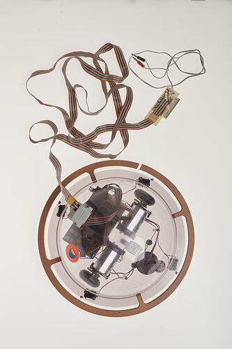 The robotic toy comprises a hemispherical case of transparent grey acrylic with a flat flange, to which a clear circular acrylic base, separated by a 15 mm gap, is joined at four points on the periphery with bakelite and spring-steel bump sensors. There is a small triangular label with a green logo and black, printed text on the top surface of the base. A freely-moving, light-brown moulded plastic ring, approximately 40 mm larger in diameter than the domed case, is positioned in the gap above the base. The ring is broken at one point and a short strip of green pastic tape is stuck at one side of the break. There are two black rubber wheels protruding through slots in the base and two domed timber supports joined to the base with metal screws. Internally there are two metal-cased motors, one to each wheel; a stack of three microprocessor circuit boards, multi-coloured cables and wires, a small speaker and two green and four red light-emitting diodes. A 25-pin male 'D-shape' connector socket is fixed near the top of the domed case. A circular shape 45 mm diameter of bright orangle plastic, with a superimposed smaller circle of blue paper, is fixed to the outer surface of the domed case.