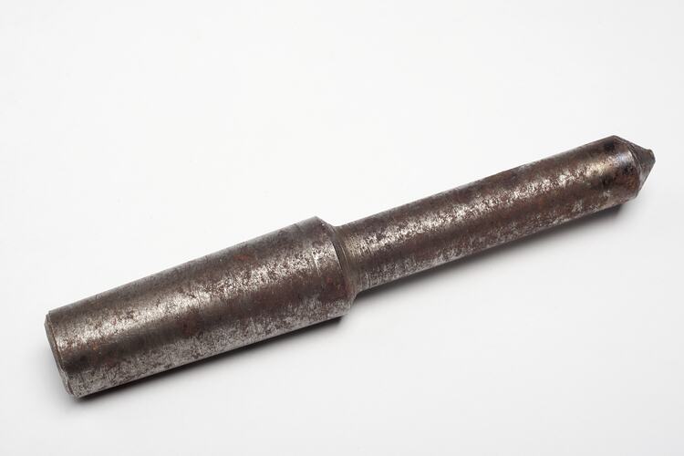 Unidentifiable steel tool part. The part is cylindrical in shape (wider at the base) with a pointed tip.