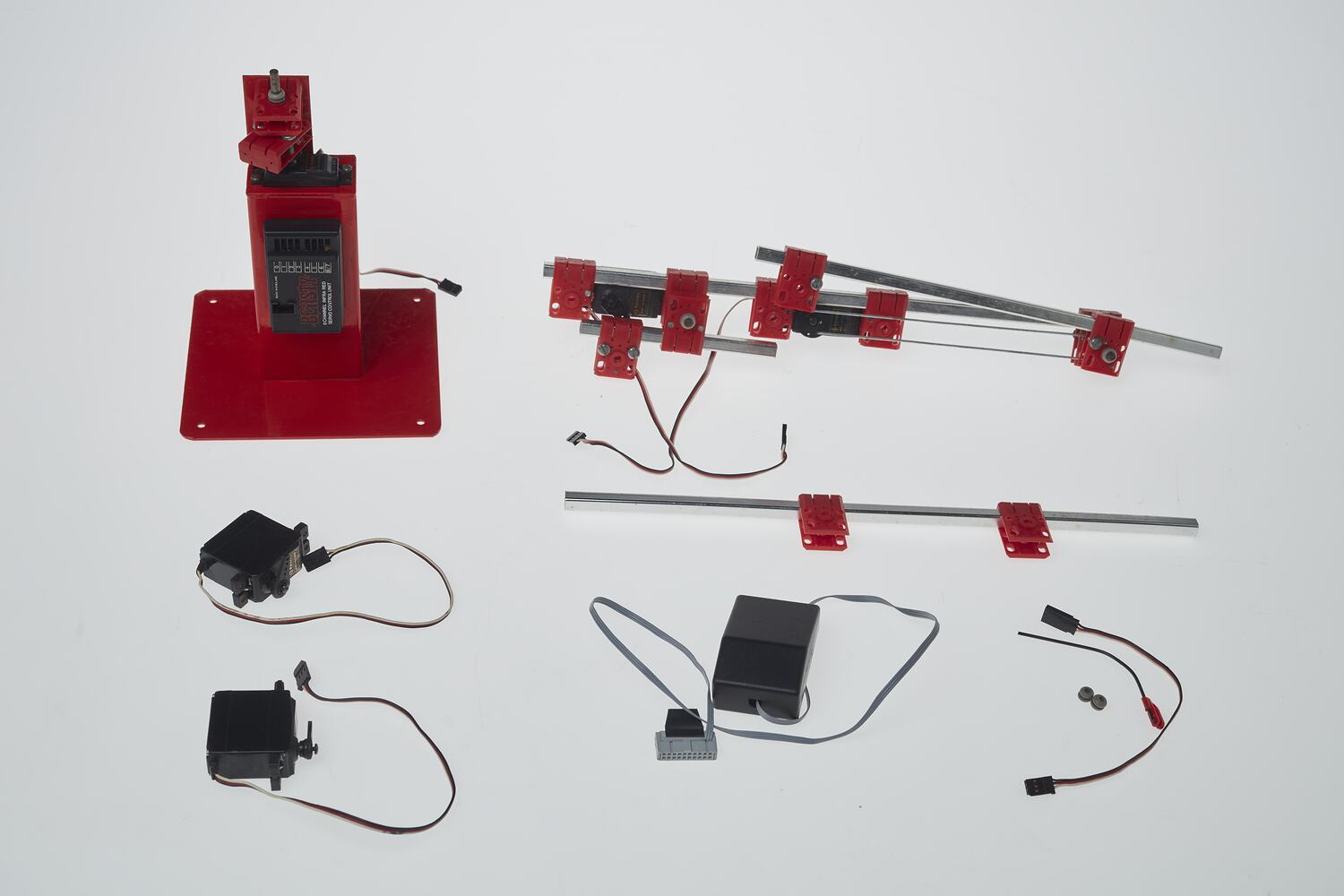 A red-painted metal base comprising two parts joined by two small bolts with hexangon-headed nuts, a flat square base with a hole in each corner, and a rectangular hollow tube upright. The tube is capped with a metal plate with an oblong cutout and four screw-holes, which is welded to the tube. Part of this end-cap is bent at a right angle and has a hole in each of its top corners. A black plastic-encased 8-channel infra-red control unit is fixed to the side of the rectangular tube with tape and a black plastic-encased servo motor is fixed with two screws in the oblong cutout in the end-plate of the tube with a length of red, white and blue lead with a connecting plug projecting from the top of the stand. Two red plastic brackets supporting a steel axle are fixed to the upstand of the tube capping and to the servo motor with steel self-tapping screws. There is a label with printed text fixed to the servo motor and another to the control unit.