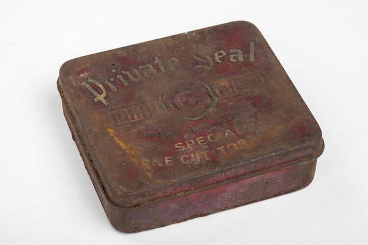 Painted lid of tobacco tin "PRIVATE SEAL / PS / QUALITY UNCHALLENGED / SPECIAL / FINE CUT TOBACCO".