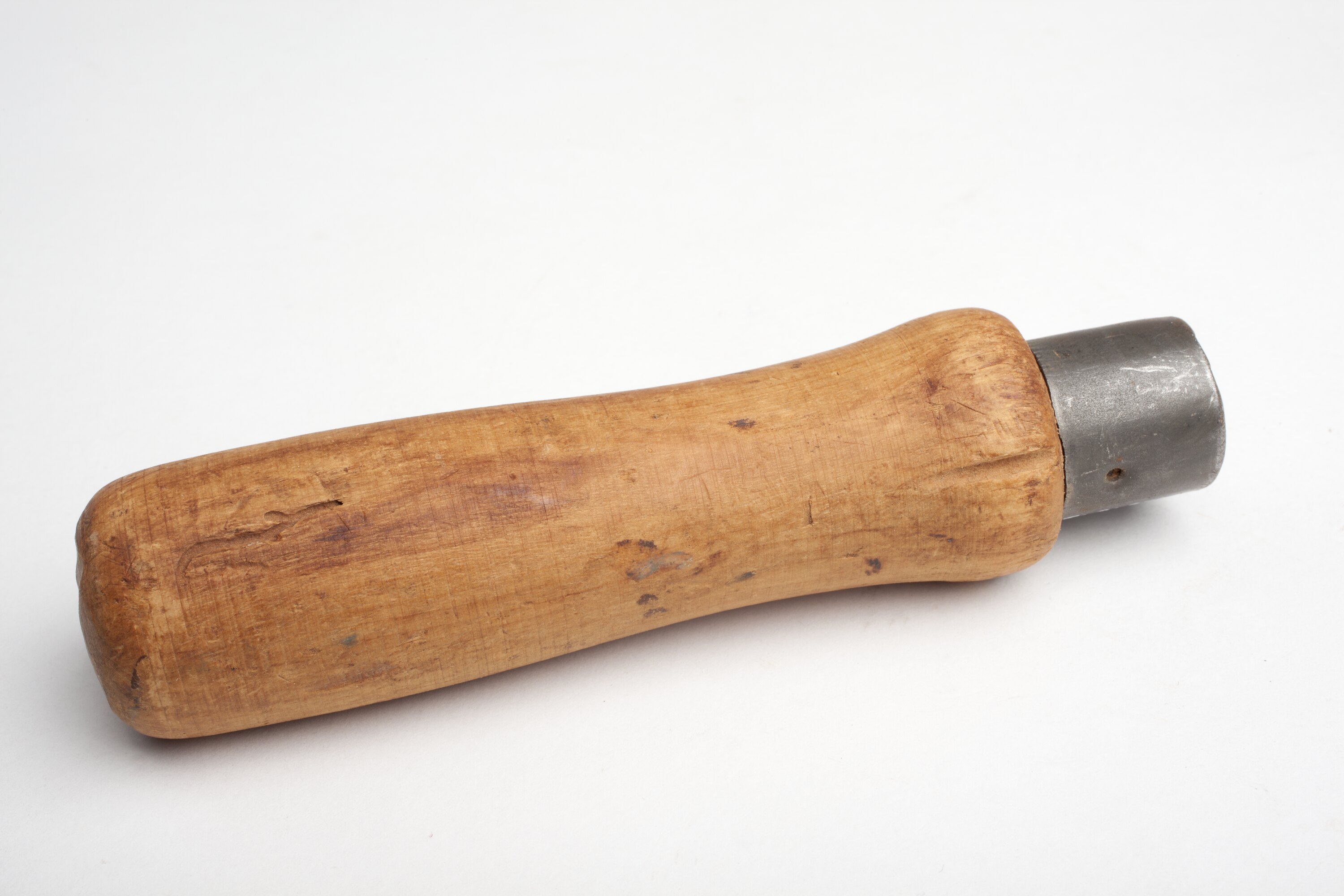 Untreated wood turning tool handle at the base of which is a metal hoop or ferrule which prevents the handle splitting.