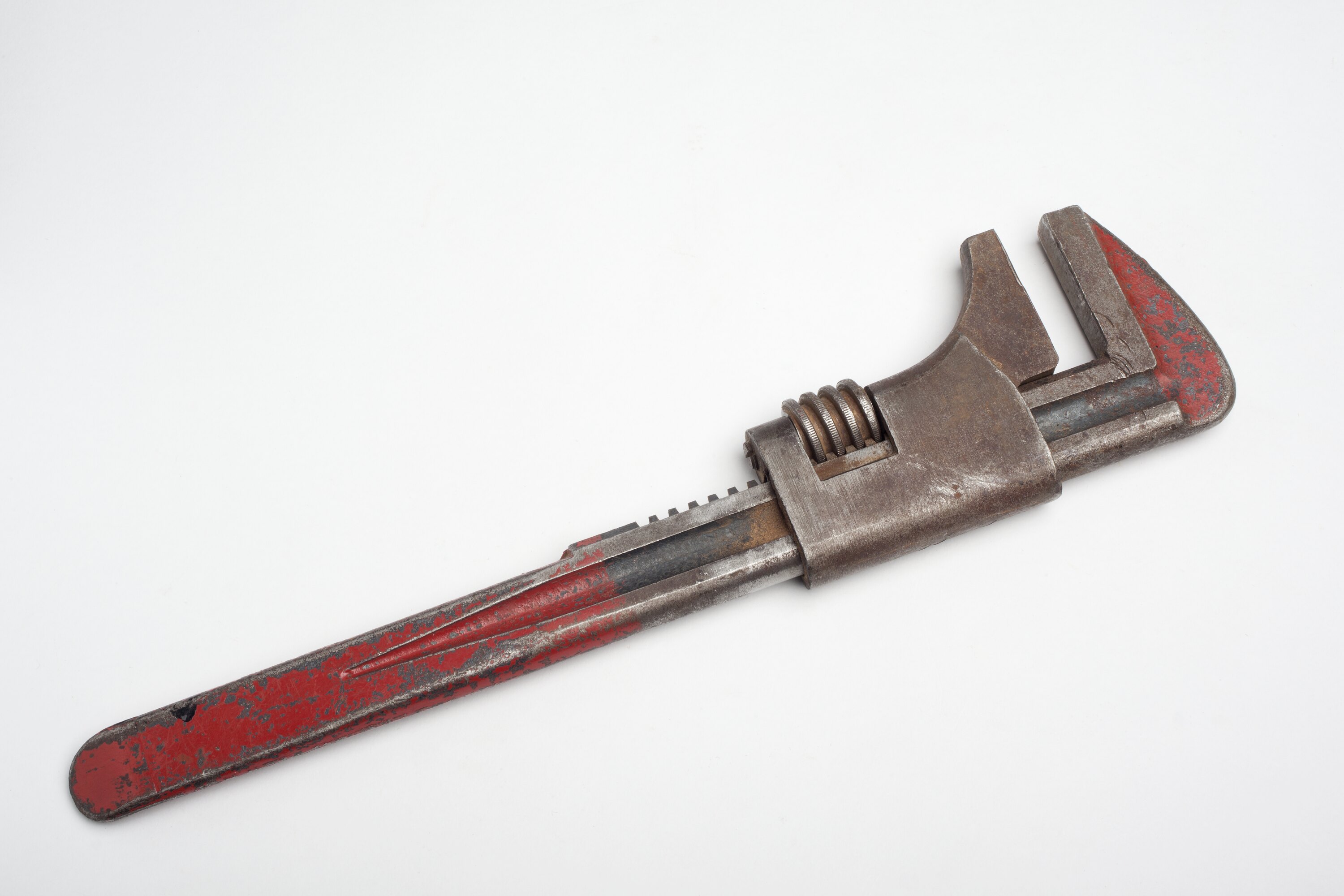 Adjustable wrench with handle and head painted red. By manipulating the lower jaws of the wrench the tool can accommodate a nut approximately six centimetres in diameter.