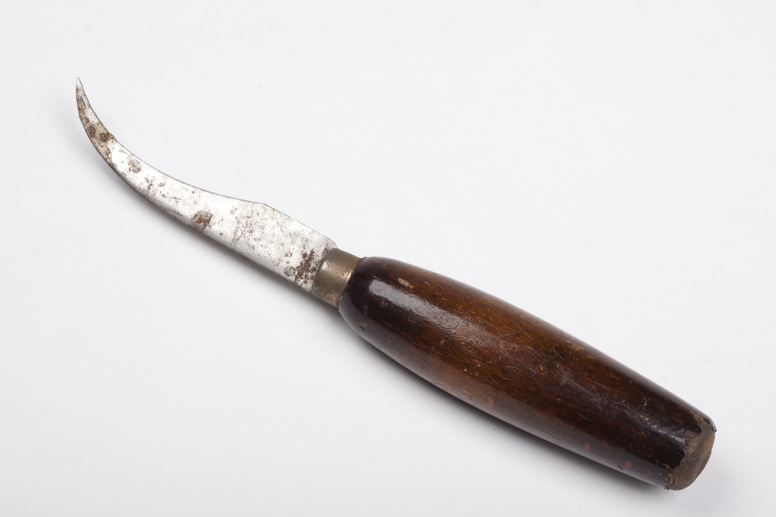 Knife with curved steel blade (one cutting edge) and a polished wood handle with a metal hoop to prevent splitting.