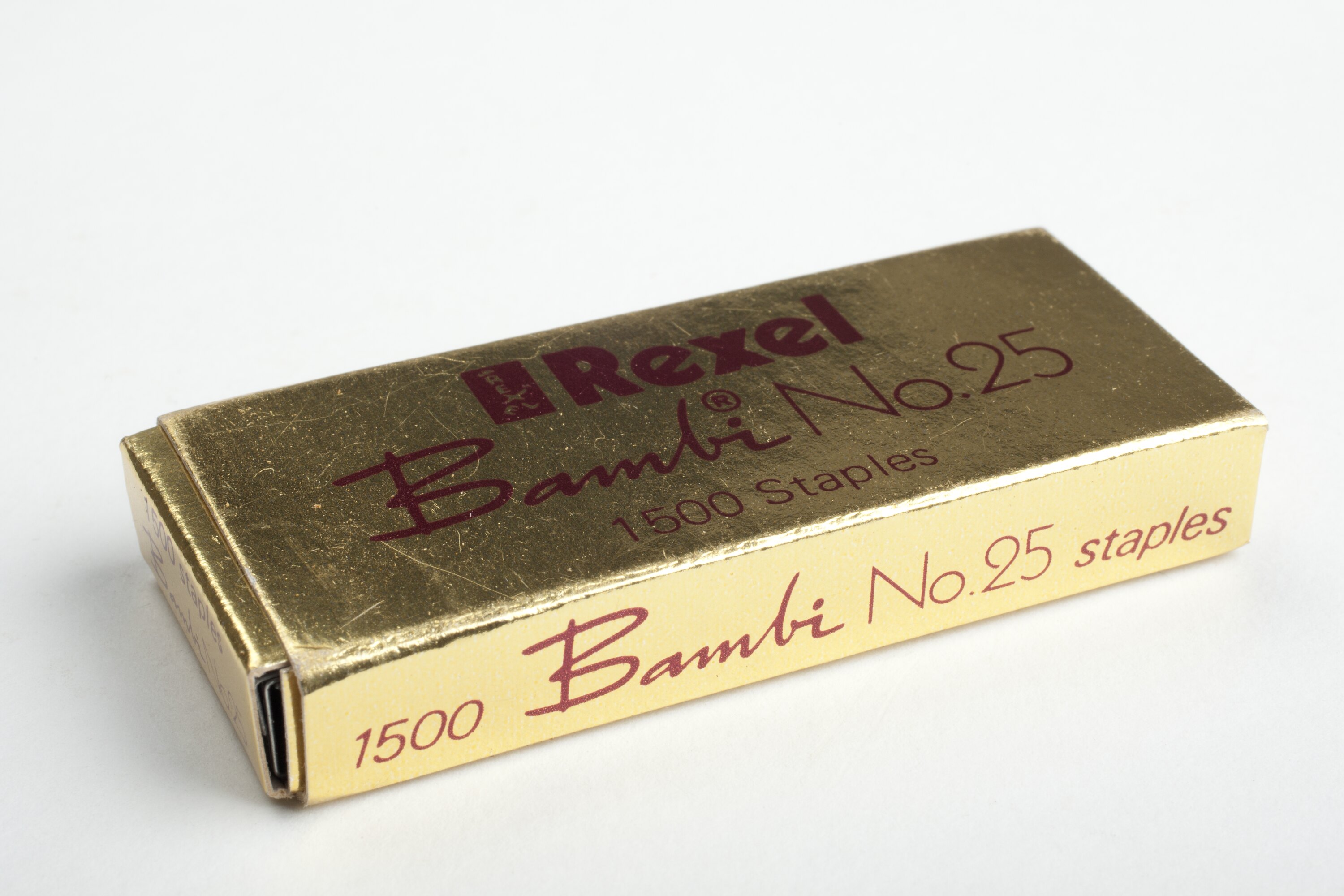 Printed, box: Rexel/Bambi R No.25/1500 Staples/The only genuine staples for Rexel Bambi R/and Nipper stapling machines/CAUTION/when using stapling equipment/take care to keep your fingers clear of the staple ejection/area/Contents made in Gt. Britain/Carton printed in Gt. Britain.