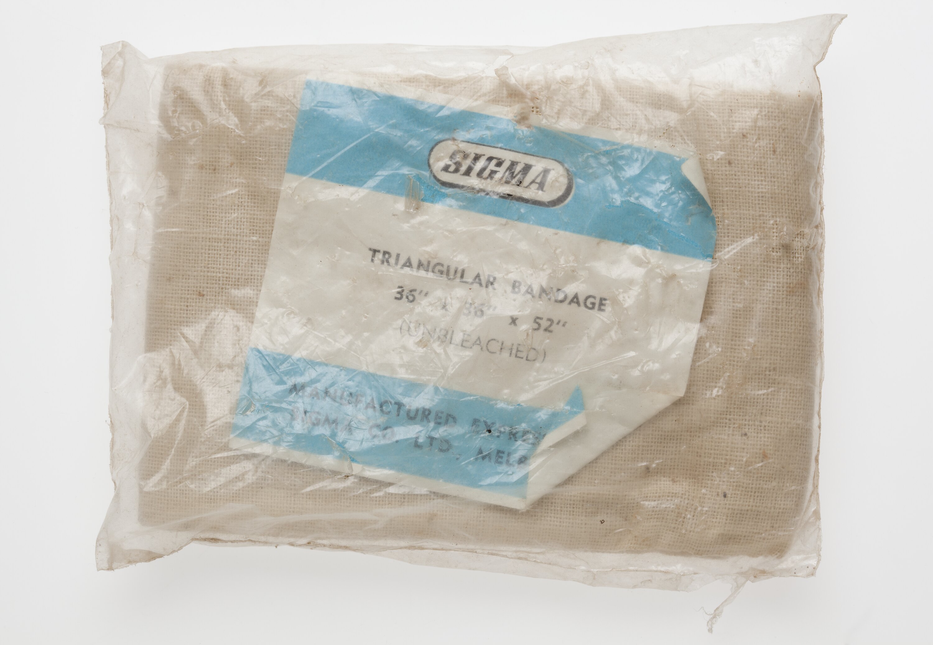 Triangular bandage made by Sigma Co. Ltd, circa 1970 - 1990. It is part of a homemade First Aid Kit which was most likely compiled by Sophus Bruhn, circa 1970-1990. The kit was found in Area C at Adolph Bruhn & Son's Wood Turners Shop, 283 Coventry Street, South Melbourne. The business was established by Adolph Bruhn circa 1893 in Little Collins Street, Melbourne. Upon his death in 1919 it was then operated by Adolph's son Sophus Christopher Bruhn. Upon Sophus's death in 1959 his son Sophus Walter Bruhn took over the business. In 1970 Sophus reduced the scale of the business and relocated to South Melbourne. The business closed upon Sophus's death in January 1990.