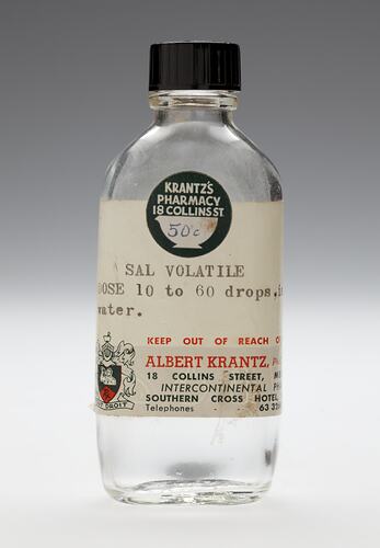 Printed label: KRANTZ'S/PHARMACY/18 COLLINS ST./50 C/SAL VOLATILE/DOSE 10 TO 60 DROPS, IN/WATER, KEEP OUT REACH OF CHILDREN/ALBERT KRANTZ, PH.C., F.P.S.V./18 COLLINS STREET, MELBOURNE/INTERCONTINENTAL PHARMACY/SOUTHERN CROSS HOTEL, MELBOURNE/TELEPHONES 63 3264, 63 1796.