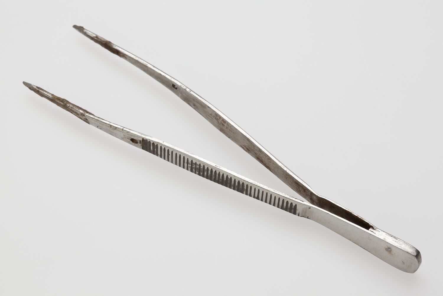 Stainless Steel Tweezers, made by C. Johnson & Co, circa 1970 - 1990. They are part of a homemade First Aid Kit which was most likely compiled by Sophus Bruhn, circa 1970-1990. The kit was found in Area C at Adolph Bruhn & Son's Wood Turners Shop, 283 Coventry Street, South Melbourne. The business was established by Adolph Bruhn circa 1893 in Little Collins Street, Melbourne. Upon his death in 1919 it was then operated by Adolph's son Sophus Christopher Bruhn. Upon Sophus's death in 1959 his son Sophus Walter Bruhn took over the business. In 1970 Sophus reduced the scale of the business and relocated to South Melbourne. The business closed upon Sophus's death in January 1990.