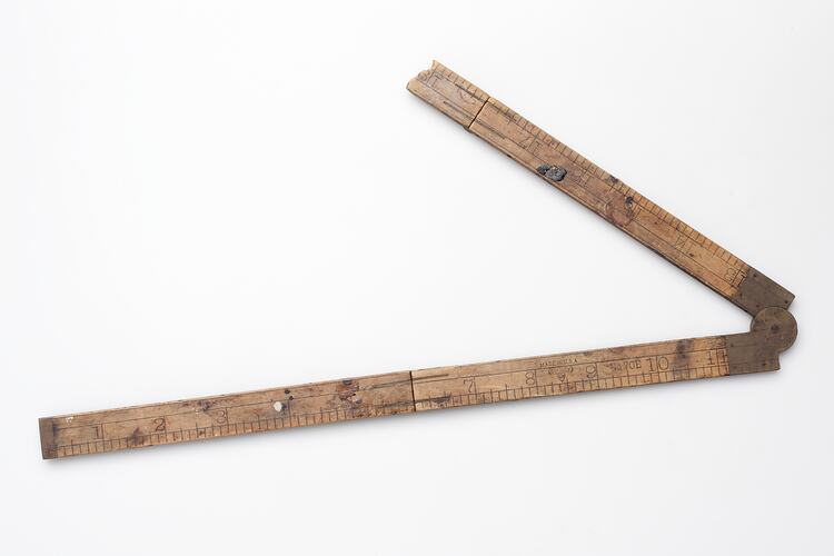 Folding ruler made by Stanley, circa 1970-1990. It was taken from Area C at Adolph Bruhn & Son's Wood Turners Shop, 283 Coventry Street, South Melbourne. The business was established by Adolph Bruhn circa 1893 in Little Collins Street, Melbourne. Upon his death in 1919 it was then operated by Adolph's son Sophus Christopher Bruhn. Upon Sophus's death in 1959 his son Sophus Walter Bruhn took over the business. In 1970 Sophus reduced the scale of the business and relocated to South Melbourne. The business closed upon Sophus's death in January 1990.