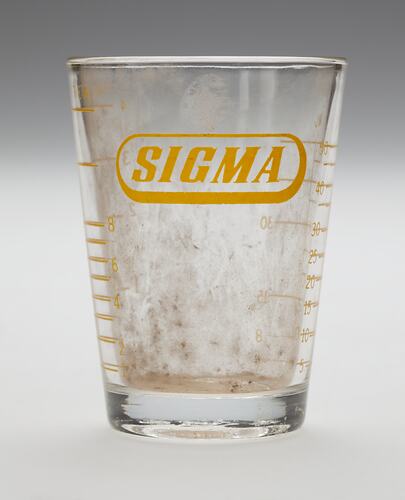 Medicine glass made by Crown Ware, circa 1970 - 1990. It is part of a homemade First Aid Kit which was most likely compiled by Sophus Bruhn, circa 1970-1990. The kit was found in Area C at Adolph Bruhn & Son's Wood Turners Shop, 283 Coventry Street, South Melbourne. The business was established by Adolph Bruhn circa 1893 in Little Collins Street, Melbourne. Upon his death in 1919 it was then operated by Adolph's son Sophus Christopher Bruhn. Upon Sophus's death in 1959 his son Sophus Walter Bruhn took over the business. In 1970 Sophus reduced the scale of the business and relocated to South Melbourne. The business closed upon Sophus's death in January 1990.