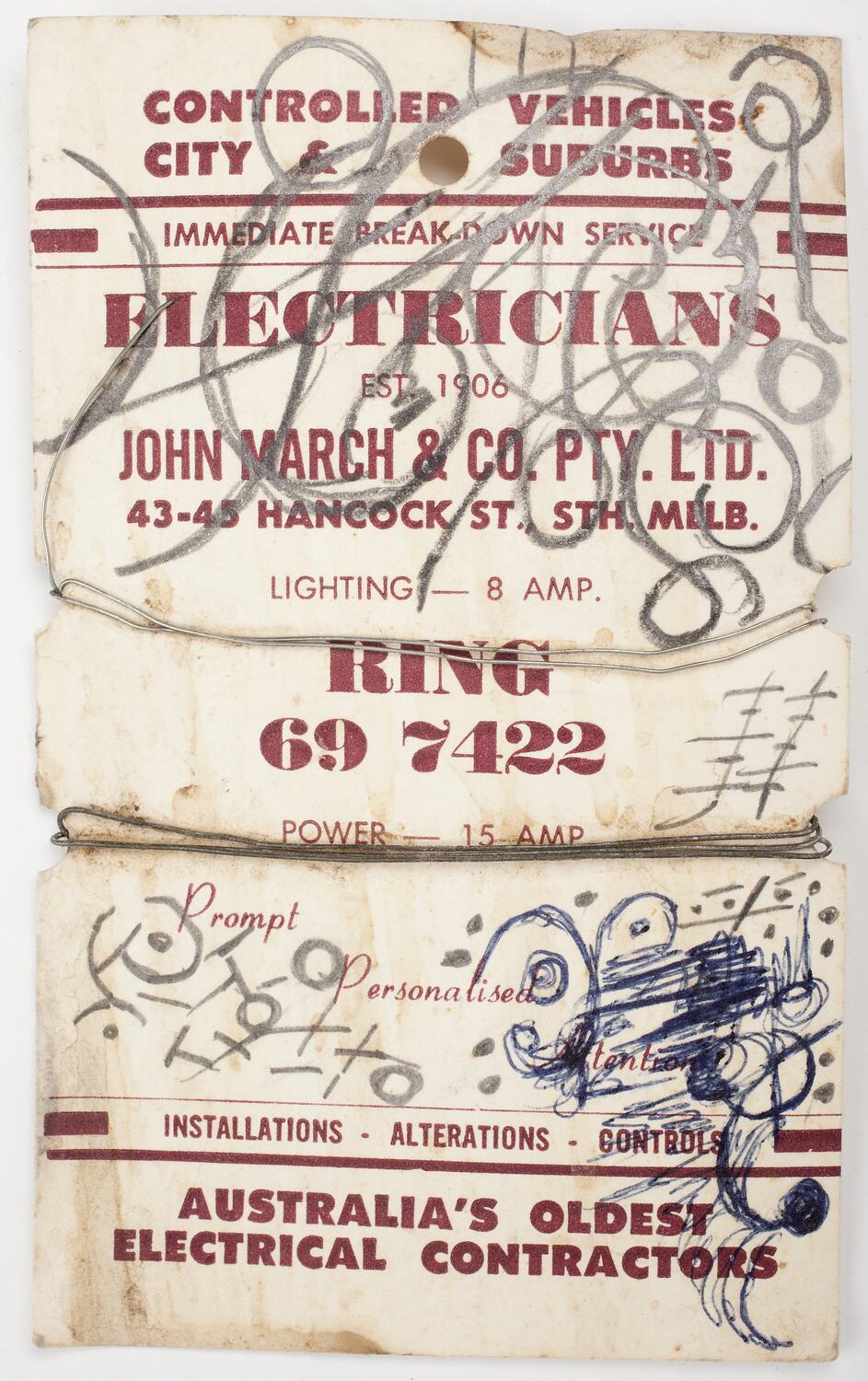 Printed front: CONTROLLED VEHICLES/CITY & SUBURBS/ IMMEDIATE BREAKDOWN SERVICE/ELECTRICIANS/EST. 1906/JOHN MARCH & CO.PTY. LTD./ 43-45 HANCOCK ST. STH.MELB./RING 69 7422/PROMPT/PERSONALISED/ ATTENTION/INSTALLATIONS.ALTERATIONS.CONTROLS/AUSTRALIA'S OLDEST/ELECTRICAL CONTRACTORS.