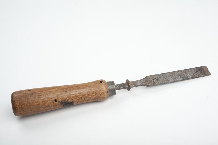 Turning chisel manufactured by Ward, circa 1970-1990. It was found in Area B1 at Adolph Bruhn & Son's Wood Turners Shop, 283 Coventry Street, South Melbourne. The business was established by Adolph Bruhn circa 1893 in Little Collins Street, Melbourne. Upon his death in 1919 it was then operated by Adolph's son Sophus Christopher Bruhn. Upon Sophus's death in 1959 his son Sophus Walter Bruhn took over the business. In 1970 Sophus reduced the scale of the business and relocated to South Melbourne. The business closed upon Sophus's death in January 1990.
