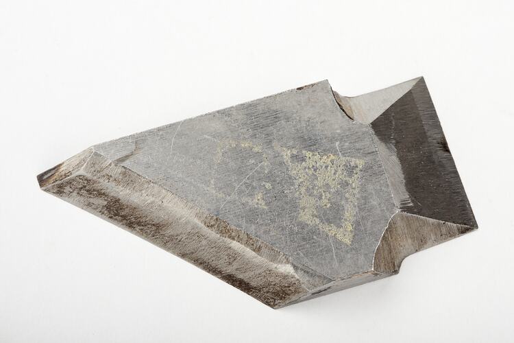 Steel cutter, circa 1970-1990. It was found in the drawer of a cabinet in Area E4 in Adolph Bruhn & Son's Wood Turners Shop, 283 Coventry Street, South Melbourne. The business was established by Adolph Bruhn circa 1893 in Little Collins Street, Melbourne. Upon his death in 1919 it was then operated by Adolph's son Sophus Christopher Bruhn. Upon Sophus's death in 1959 his son Sophus Walter Bruhn took over the business. In 1970 Sophus reduced the scale of the business and relocated to South Melbourne. The business closed upon Sophus's death in January 1990.