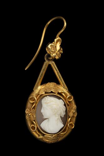 One of a pair of gold mounted cameo ear pendants attributed to Thomas Gaunt of Melbourne, made circa 1870.