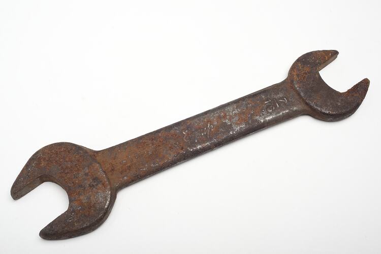 Blackened steel double-headed spanner. Jaws of the spanner are dimensioned to accommodate 1/2 inch and 7/16 inch BSW nuts and bolts.