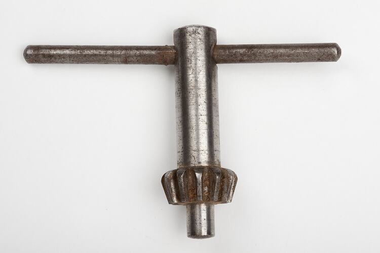 Steel key consisting of a cylindrical centre piece (with cog) and smaller cylindrical cross piece. The key is used to tighten the chuck of a drilling machine.