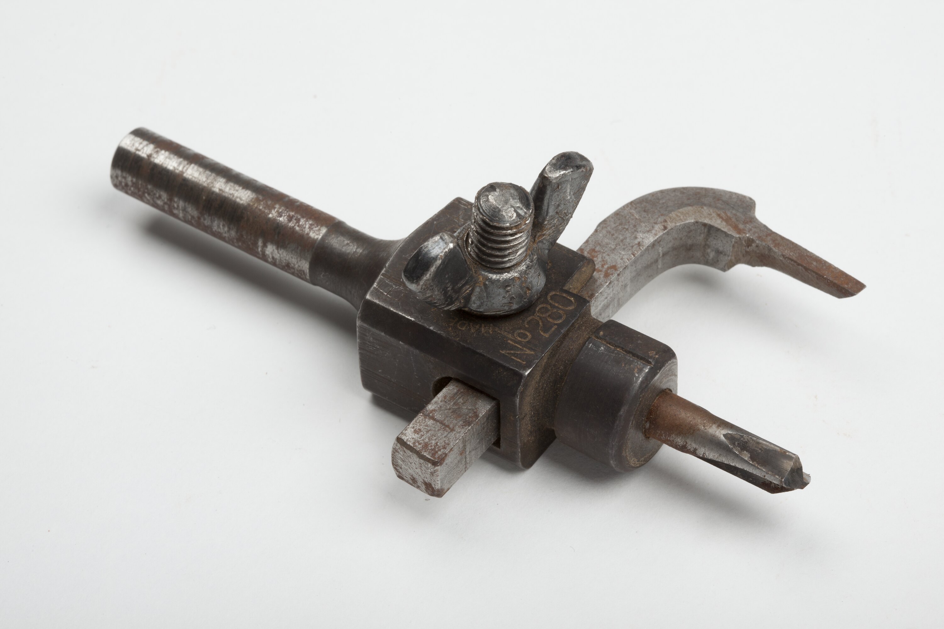 Steel expansive bit. The neck and pinion of the bit can be adjusted by loosening a wing nut.