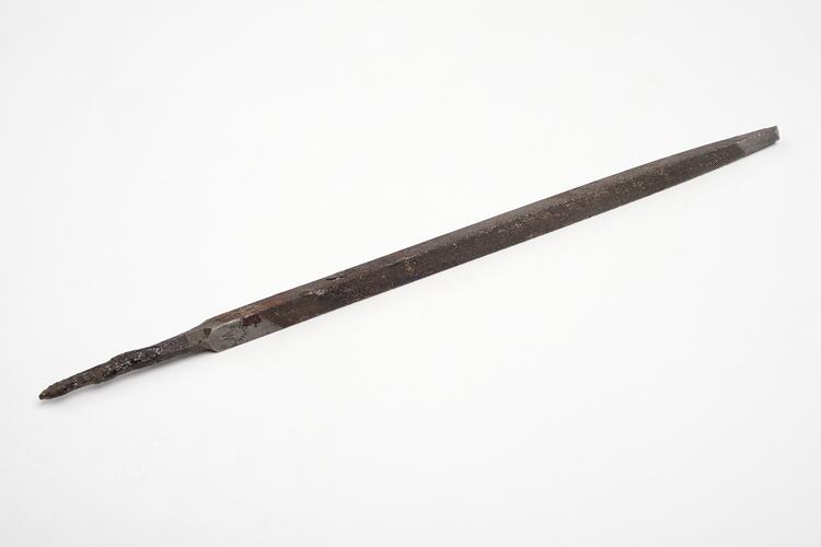 Triangular File manufactured by Wiltshire, circa 1950-1970. It was found in a cabinet in Area E4 in Adolph Bruhn & Son's Wood Turners Shop, 283 Coventry Street, South Melbourne. The business was established by Adolph Bruhn circa 1893 in Little Collins Street, Melbourne. Upon his death in 1919 it was then operated by Adolph's son Sophus Christopher Bruhn. Upon Sophus's death in 1959 his son Sophus Walter Bruhn took over the business. In 1970 Sophus reduced the scale of the business and relocated to South Melbourne. The business closed upon Sophus's death in January 1990.