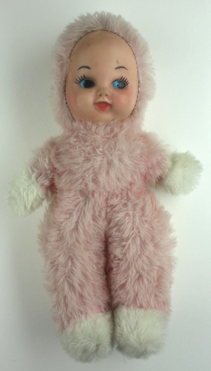 Doll covered in a pink nylon plush on body and head, with white nylon plush on hands and feet forming what might be a jumpsuit with hood. Face made of soft vinyl, moulded to form eyes, small nose and open mouth. The vinyl face is stitched to the plush fabric around the head. Facial features have been painted onto the face with dark eyebrows and eyelashes, two-toned black/blue eyes, pink mouth and pink cheeks. There is a white cotton label sewn on the underside of the right foot with 'Jakas Toys' embroidered in red.
