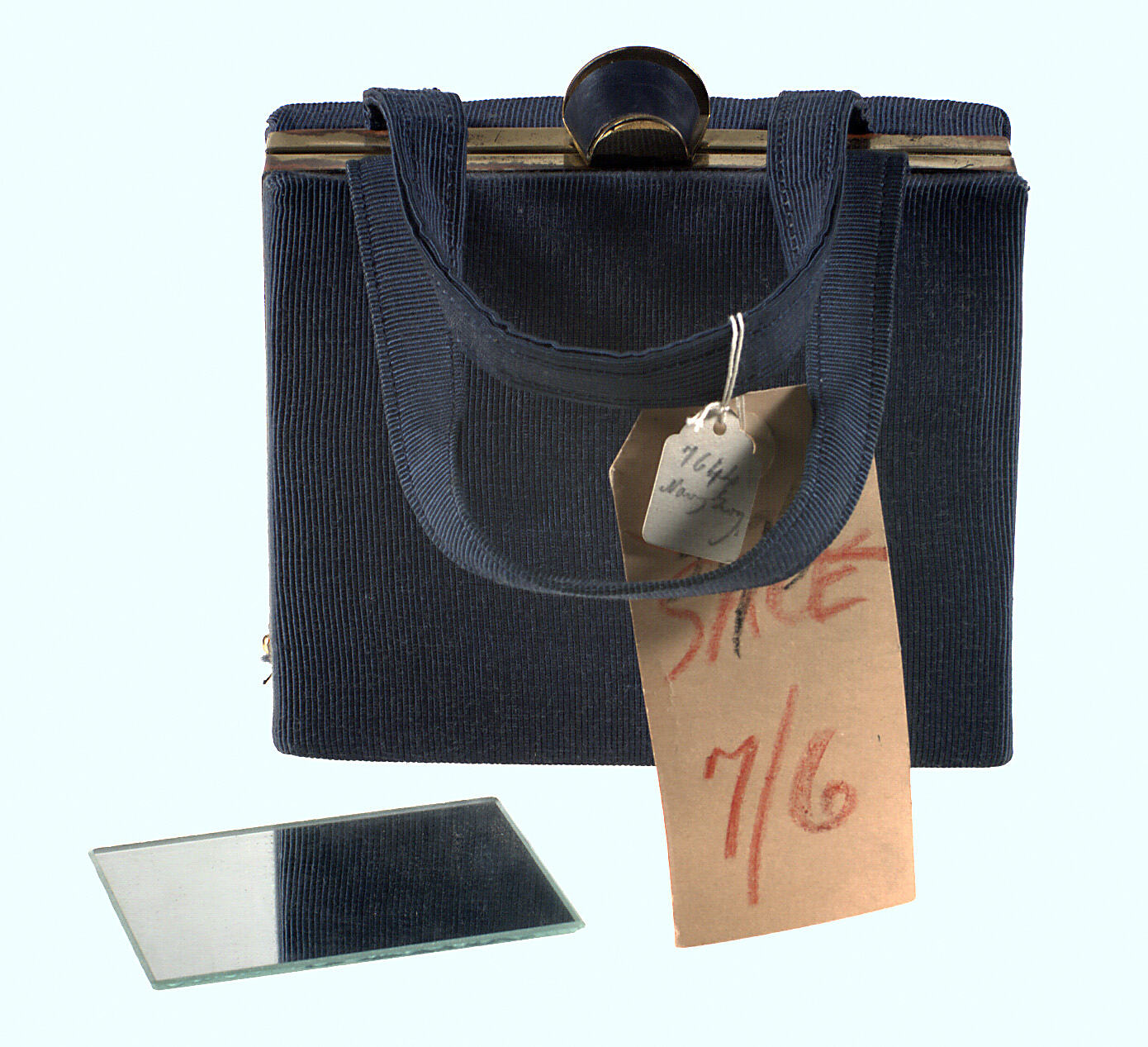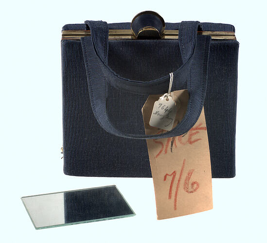 Dull blue ladies' grosgrain handbag sample, box style with gilt trim. Made by Simpson's Gloves Factory, Richmond, Victoria, Richmond, circa 1960.