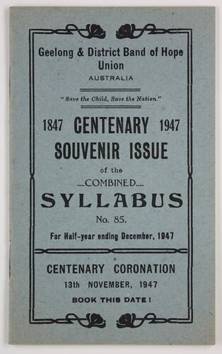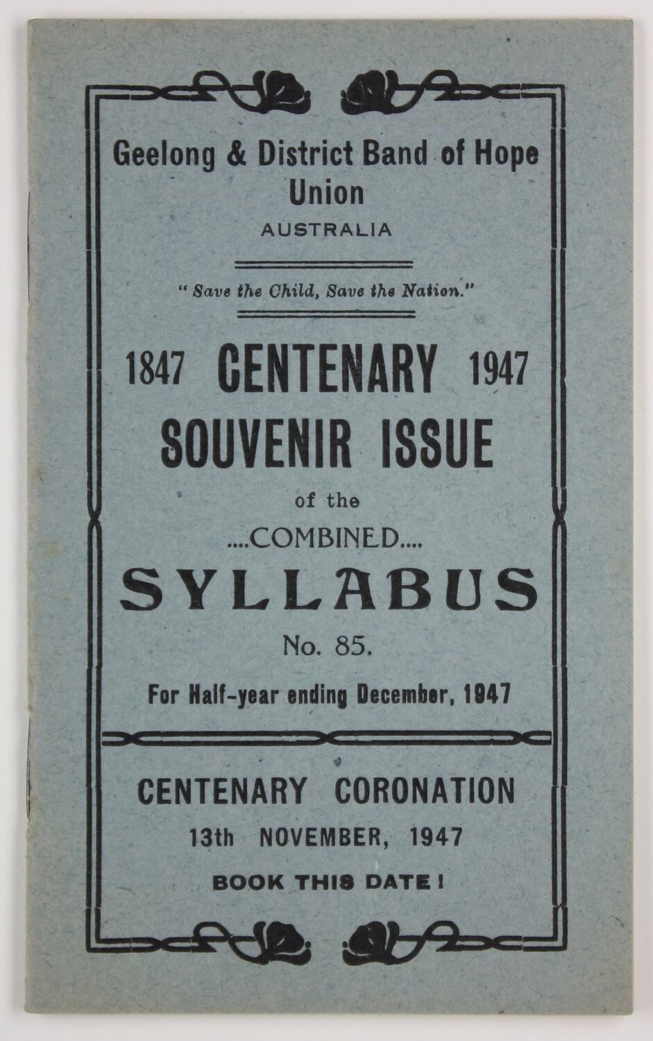 Printed text: 'Geelong & District Band of Hope / Union / AUSTRALIA / 1847 CENTENARY 1947 / SOUVENIR ISSUE / of the / COMBINED / SYLLABUS / No. 85.'.