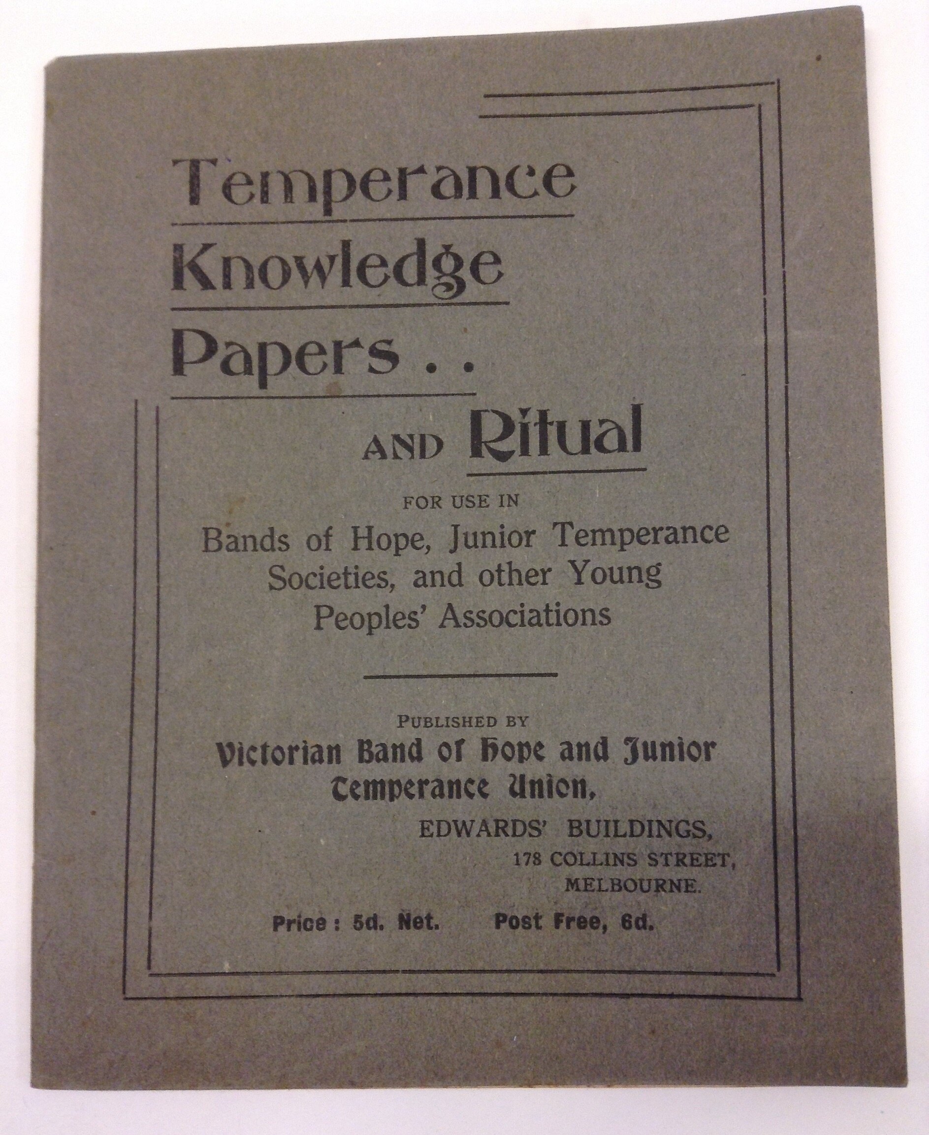 Contains 'temperance knowledge paper and ritual for use in Bands of Hope, junior Temperance Societies, and other Young People's Associations'. The booklet contains a selected ritual and order of meeting, together with 12 papers on various aspects of temperance.