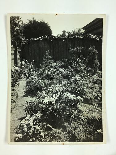 Black and white photograph of the front garden of Setsutaro Hasegawa's home at 21 Little Ryrie Street, Geelong, circa 1942. According to his family descendants, Setsutaro kept a beautiful garden.