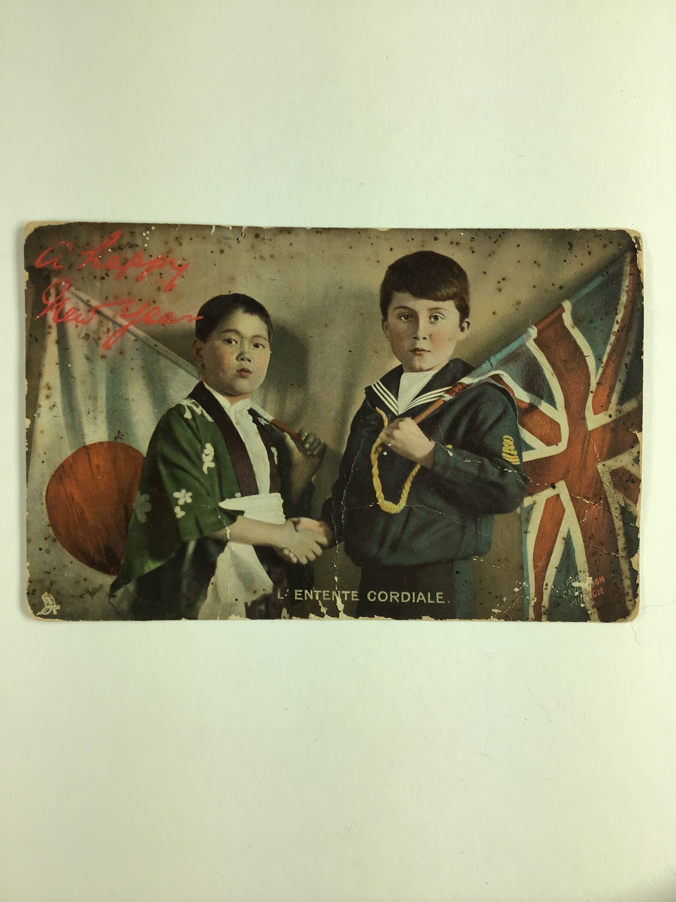 Coloured postcard featuring a Japanese child wearing traditional clothing and British child in naval uniform holding their national flags and shaking hands.