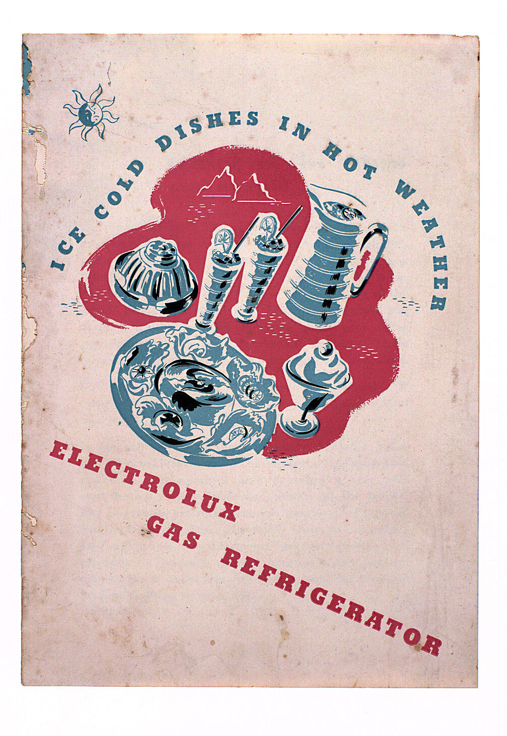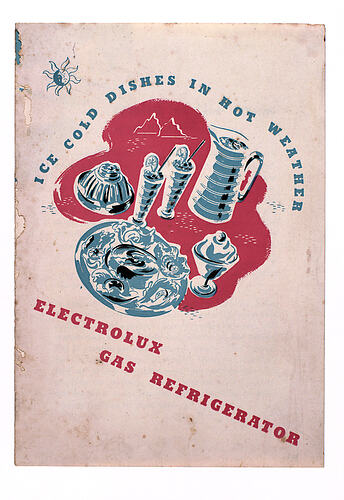Booklet titled 'Ice Cold Dishes in Hot Weather, Electrolux Gas Refrigerator', it was published by Electrolux circa 1950. It contains recipes for desserts using the refrigerator as well as advice on the use and care of the appliance. It belonged to the donor's mother (Effie Laura Harvie) who accumulated a collection of recipe books over the years.
