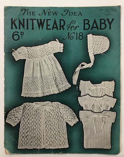 The New Idea Knitwear For Baby No. 18 book printed and published by Fitchett Brothers Pty. Ltd, Stanley St., West Melbourne, circa 1930-1939. The book contains patterns for various infants garments.